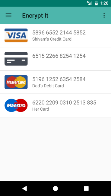 Here is the solution 'Encrypt It'. This app will save your data safely and you will never have to remember passwords or card details anymore. We converts your passwords, files and card details into encrypted files, so that intruder does not have any access to this. We use "SHA-512" algorithm in our app which is unbreakable, unhackable. So your data is safe.