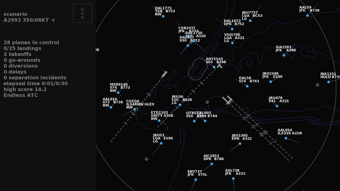 Endless ATC is a realistic and easy to play Air Traffic Control simulator. As an Approach Controller at a busy airport, you guide as many planes as you can safely to the runways. If you make no mistakes, the number of planes in your airspace gets greater and greater. Find out how many flights at a time you can manage!