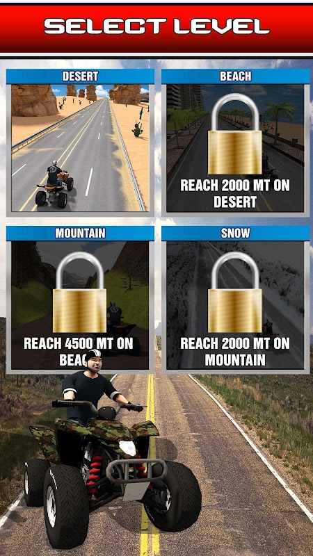 Drive the ATV Bike and avoid traffic vehicles while increasing speed to the limits. Enjoy this Extreme motorcycle quads on a dusty trail racing through desert, beach, mountain and snow. Try to get as far as possible with nitro and beat your Friends at the Leaderboards.