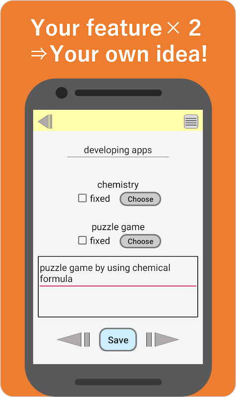“Your feature×Your feature=Your own idea” This app helps you to make new idea.