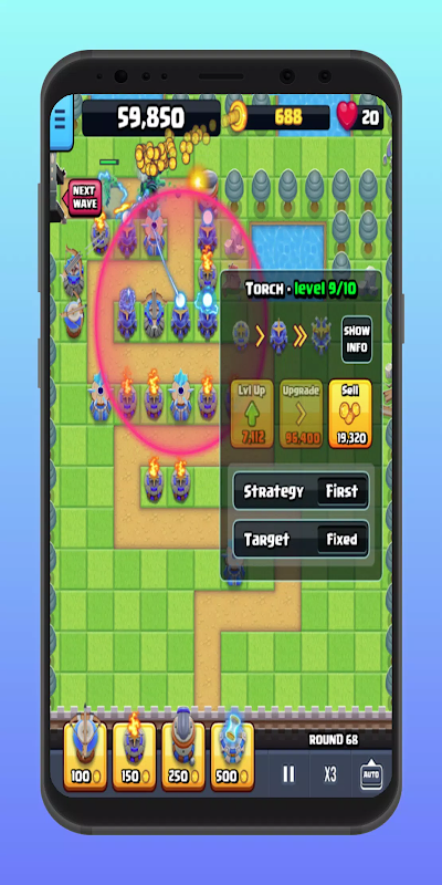 After the enemies have been killed off build new towers or upgrade existing towers then press “Next Wave” to start the next round. You can also upgrade or lay towers in the middle of battle, though it is recommended to pause the game to do so if you are switching which towers you lay or upgrade so you do not make time rushed mistakes.