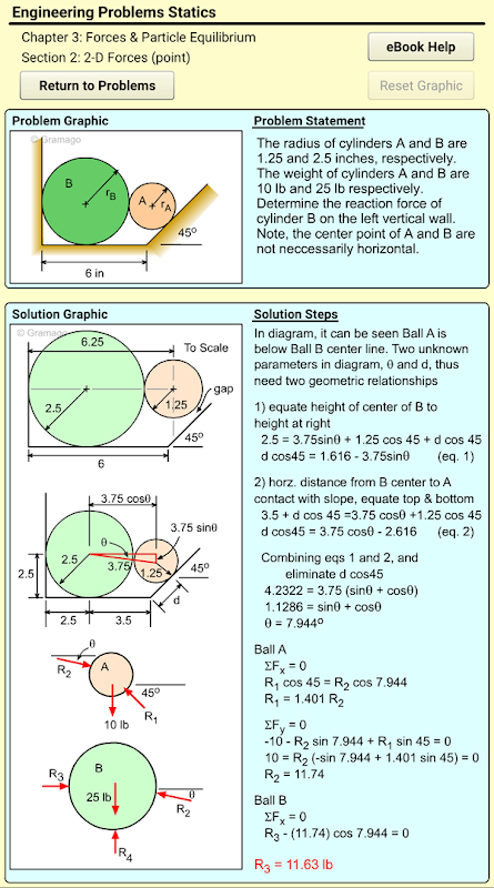 Eng Statics app provides over 500 real homework and test problems for the common engineering course called Statics. All problems are organized in sections and chapters common to most textbooks. Each problem has a complete solution with graphics to help you better understand how to solve the problem. Also, each problem has a link to a theory web page for that section at the online eBook (eCourses.ou.edu or eCoursesBook.com). There is no cost for the online eBook, and it can be accessed outside of the app.