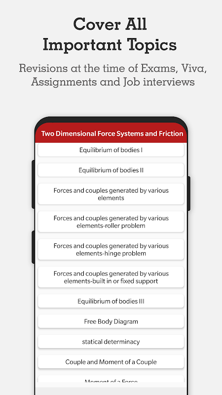 The app is a complete free handbook of Engineering Mechanics which covers important topics, notes, materials on the course. Download the App as a reference material & digital book for Diploma & degree courses.
