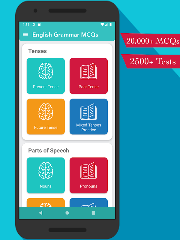 Every English grammar topic and test is covered. Such as present tense, past tense, future tense, nouns, pronouns, adjectives, adverbs, prepositions, conjunctions, interjections, quantifiers, gerunds & infinitives, are also included. We have covered almost every English Grammar topic, and we will add more topics and tests to the app every month.