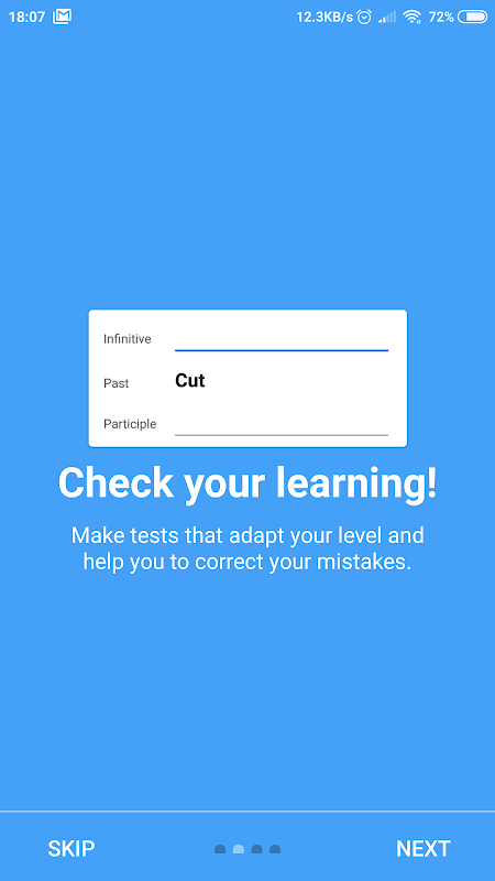 Take a test to check your learning. The tests are created adapting to your preferences and progress and help you correct your mistakes. He always asks himself first about the favorite verbs and with a lower grade.