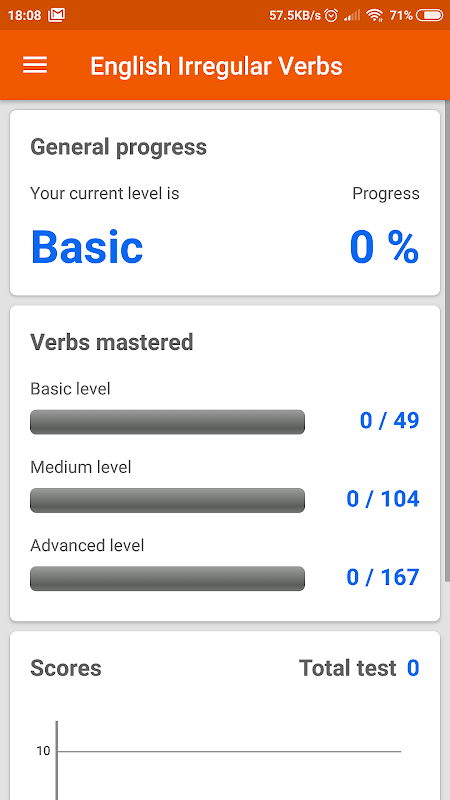 You can hear the pronunciation of a verb by clicking on it. Each verb shows a small progress bar that indicates the level of learning of it. A verb is considered fully learned when the 3 verb tenses have been correctly answered 2 times in a row. This progress data is saved on the device.