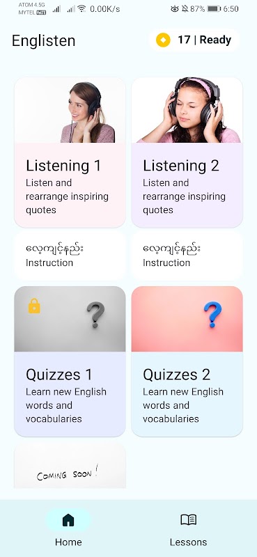 Englisten App ကိုအခမဲ့ Download ရယူနိုင်ပြီး အစပိုင်းလေ့ကျင့်ခန်းအနေနဲ့လည်း Listening အသားပေး Exercise များကိုပြုလုပ်ရမှာပါ။ ဆက်လက်ပြီးလည်း Level မြင့်လာတာနဲ့အမျှရရှိတဲ့ Coin များအသုံးပြုပြီး အခြားသော Exercise များကို ဖွင့်လှစ် (Unlock) လို့ရပါတယ်။