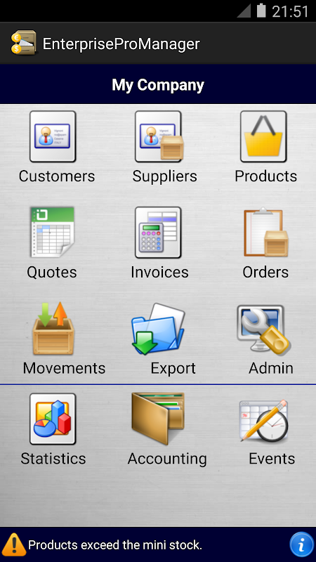 You are an entrepreneur, an independent, small or medium-sized company, liberal profession... EnterpriseProManager was designed for you in a customizable way to give yourselves the possibility of managing easily your products and of adding in your invoices, quotes and orders, the useful information of your company which change a country in an other one, such as: N VAT, TAX, VAT, Code APE, SIRET, …