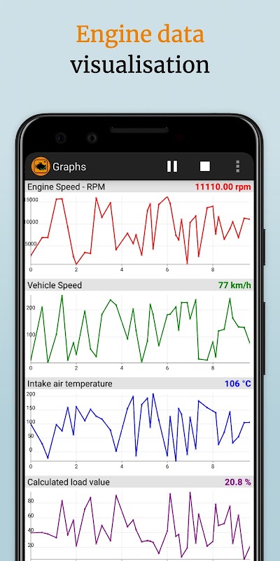 📊 Real-time display of car sensors and possibility of recording in a file. Depending on your vehicle's configuration you will be able to see: vehicle speed, engine rpm, engine temperature, ignition timing, engine torque, the amount of air intake, etc.