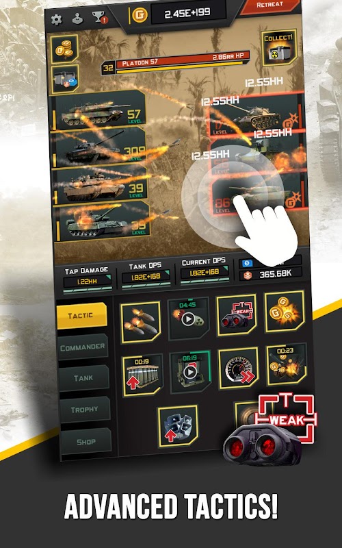Boots on the ground, fingers on the screen! You are Commander-in-Chief, with an army to build and solidiers to lead, in all-new idle clicker where tapping is modern warfare. Construct your forces by deploying tanks to the field, and tap away to unleash an unrelenting assault.