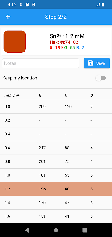 In addition, users can save the generated color, locally in the phone memory. They can also, store information about the hexadecimal value, the delta red, delta green and the delta blue. Furthermore, it is possible to define notes and their location.