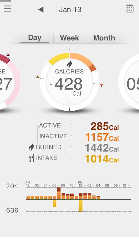 PULSENSE calculates calories burned based upon body motion and heart rate data, which is related very closely to calories burned, enabling more detailed calorie calculation. You can also input your calories manually by pressing the button.