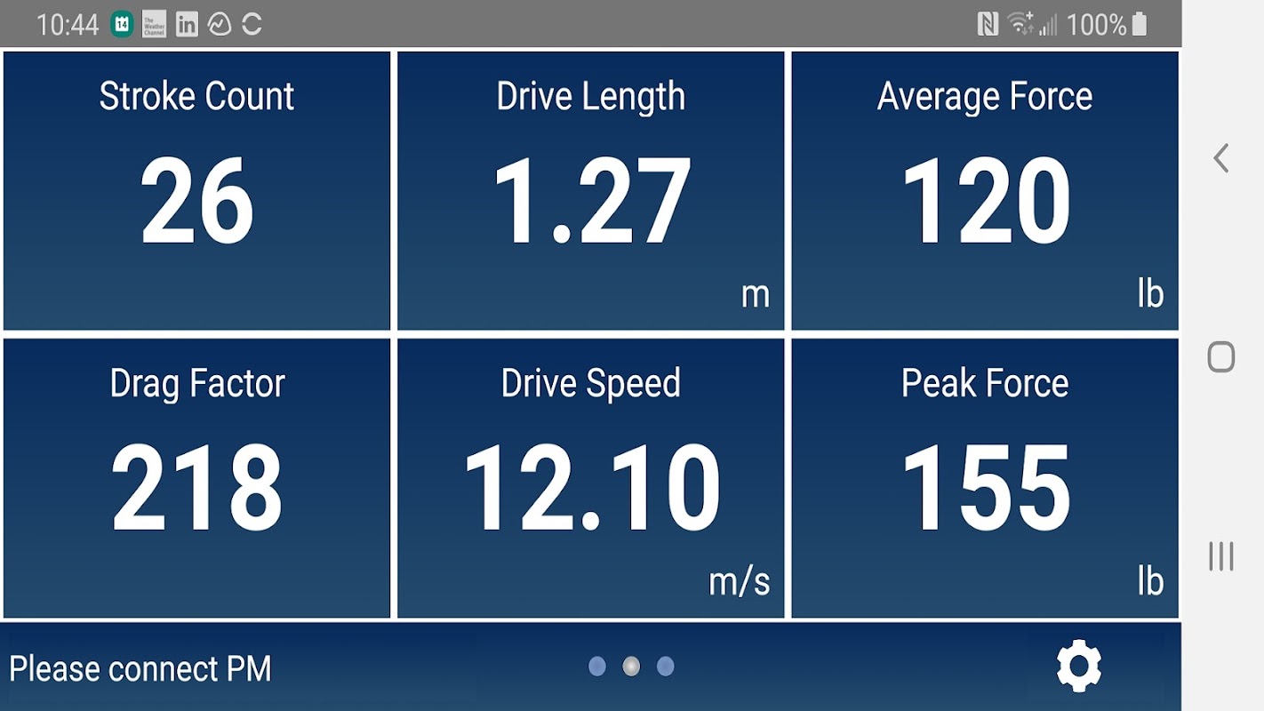 2) Screen showing: Drive Length, Drive Time, Average Force, Peak Force, Drag Factor, and Stroke Count