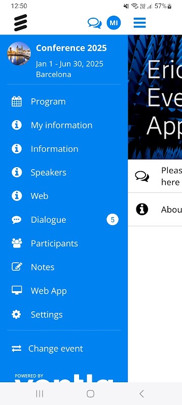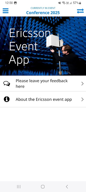 This is the Ericsson event app. It will be used for showing the agenda, speakers and other practical information about the event. In the app you will be able to answer polling questions as well as asking questions to the stage. The app will be used to send out push notifications with updates Before and During the event. We hope you will enjoy using These and many more features in the app During The Event.