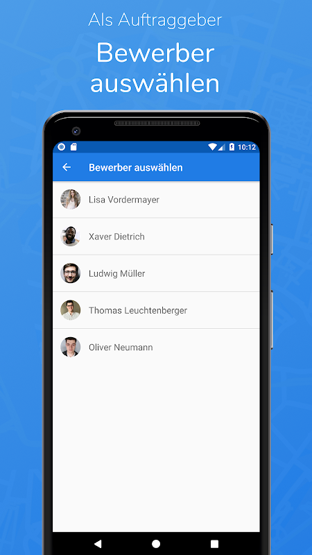 2. Bewerber auswählen - Wähle aus den verschiedenen Bewerbern einen, der für dich am besten passt. Bewertungen anderer Benutzer unserer Plattform und unser Vertrauens-Siegel helfen dir bei der Auswahl. Egal welche Hilfe du benötigst, bei uns findest du den richtigen Dienstleister für deinen Auftrag.