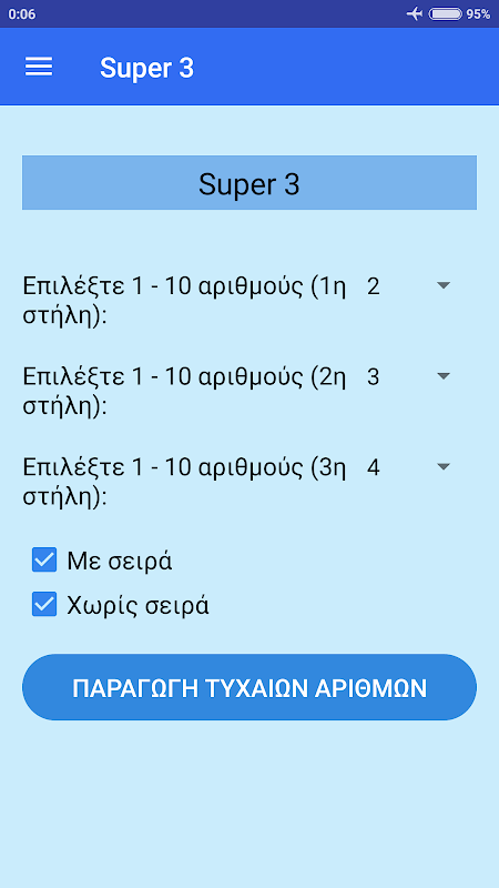 La aplicación genera números aleatorios para los juegos tzoker, lotto, kino, super 3 y extra 5.