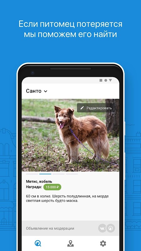 Создайте бесплатное объявление в сервисе Аверия.Поиск. В случае пропажи вашего питомца, мы сразу разместим его в популярных социальных сетях и в нашем бесплатном приложении.