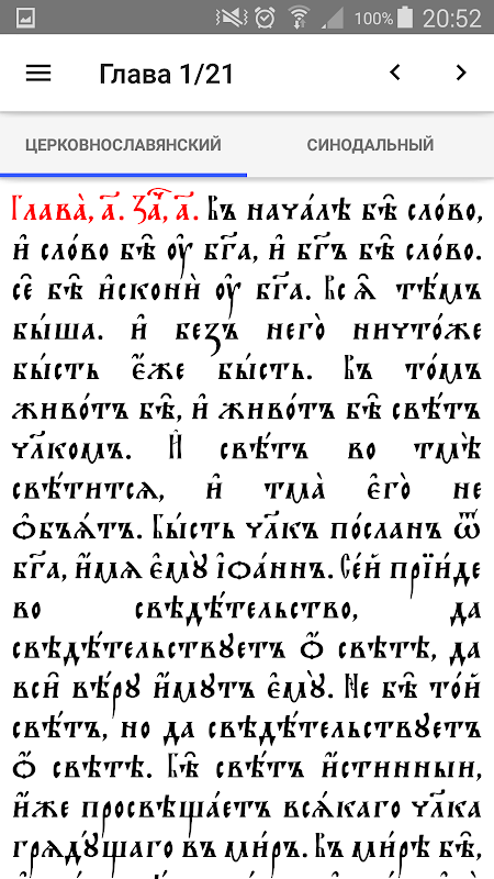 * Параллельный перевод текстов Евангелия, Апостола и Псалтыри. Возможность переключаться между дореформенным церковнославянским и синодальным переводами