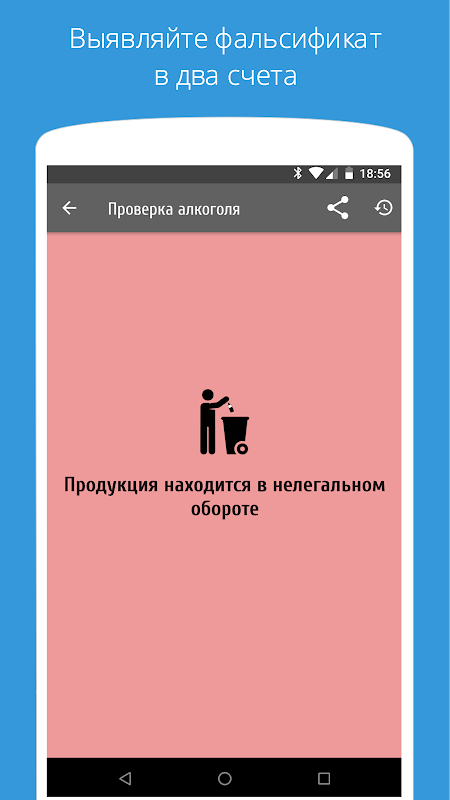 Ejecute la aplicación y escanee los códigos de barras de la etiqueta de impuestos en la botella. Después de eso, la aplicación verificará los datos con la base de datos del EGAIS del Servicio Federal para la Regulación del Mercado del Alcohol (FSAPR) y producirá el resultado.