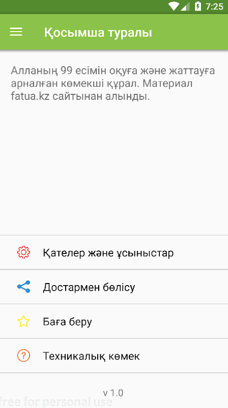 Алла Тағаланың 99 есімдерін жаттағыңыз келсе немесе есімдердің құран аяттары мен хадистерде келуін көргіңіз келсе, ин ша Алла, бұл қосымша сізге таптырмас көмекші құрал болуға дайын. Жаттау ыңғайлы болу үшін есімдерге белгі қойып, белгіленгендер тізімінен қарай аласыз. Әр есімнің оқылуын тыңдау мүмкіндігі бар.