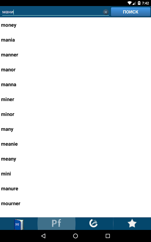 Русско-английский словарь и Англо-русский словарь (English-Russian Dictionary). Поиск по звучанию (вводим "мани" - получаем "money"!), транскрипция, оффлайн словарь (работает без доступа к интернету), 1000000 слов и фраз, корректные переводы, удобный интерфейс, избранные статьи, история поиска.