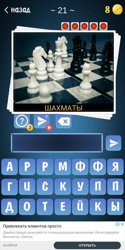 En caso de encontrar dificultades en el proceso de pasar en el juego hay dos tipos de pistas: carta abierta a la palabra 1, o abrir toda la palabra a la vez.