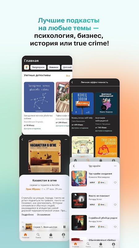 En el catálogo "Аудиостор" hay libros y podcasts de audio, que se utilizan para crear aplicaciones nuevas, которые вы только начинаете открывать для себя. У нас найдется все от тру-крайма до семейных романов и детских сказок.