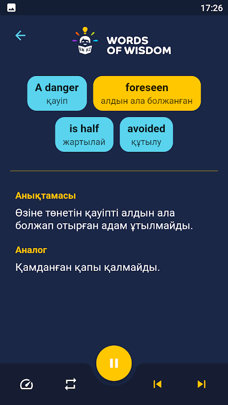 Una excelente manera de desarrollar sus habilidades lingüísticas y mejorar su inglés es aprender proverbios en inglés. La aplicación móvil Palabras de Sabiduría contiene 1000 proverbios en inglés. Cada proverbio tiene su traducción equivalente, equivalente o literal en el idioma kazajo. Además, hay explicaciones que ayudan a aclarar su significado y dominarlo por completo. Aprenderás el significado de más de 3000 elementos de proverbios en la aplicación móvil y escucharás su pronunciación. En ese momento, se forman muchas conexiones neuronales nuevas en el cerebro, la información está bien almacenada en su memoria y su conocimiento adquirido está firmemente establecido.