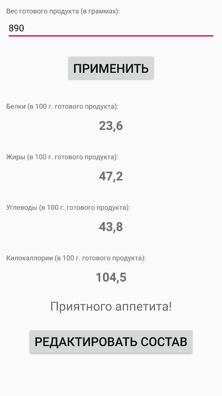 Программа позволяет считать калории, белки, жиры и углеводы в 100 граммах готового продукта на основании данных об ингредиентах.