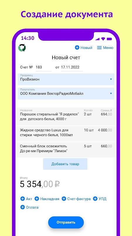 - envío de documentos directamente a Diadoc o Sbis. Envío de documentos vía archivo xml a Kaluga-Astral, 1C-EDO, Rostelecom, Sberbank, Sfera, Taxcom, Taxnet, Cislink, E disoft, e-com, Synerdocs