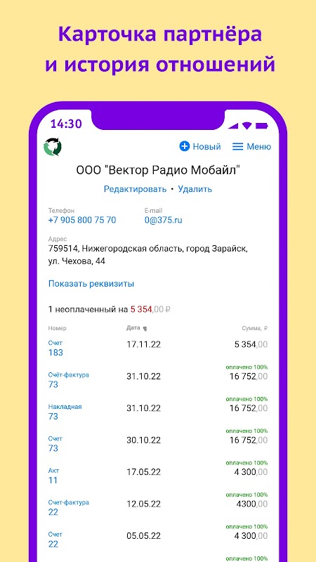 - la sección "socios" contiene contactos e historial de transacciones para todas las contrapartes