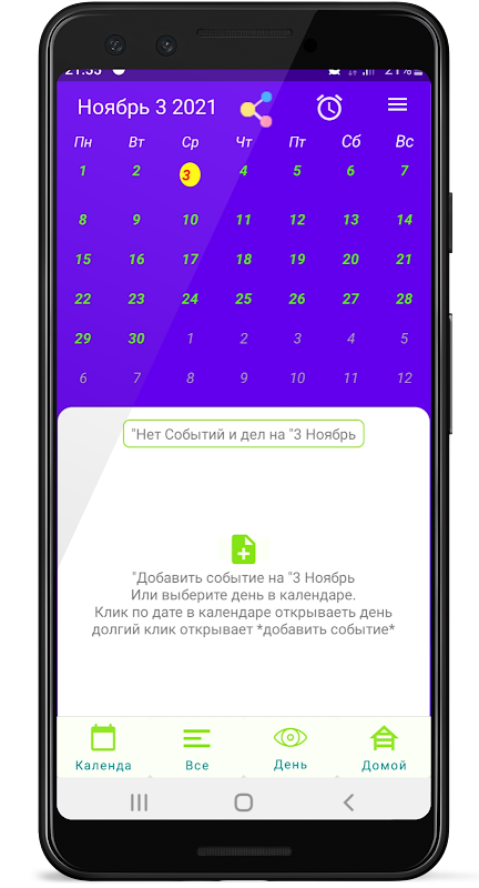 Дополнительно есть кнопки переключения вида на день и на весь месяц , и- все события и ожидающие.
