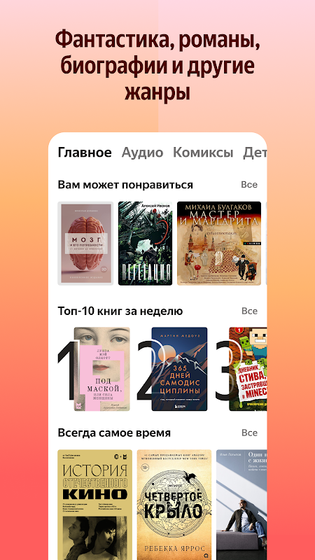 ✅ Descubre diferentes géneros: Yandex Books ofrece prosa rusa e internacional contemporánea, no ficción, negocios y Literatura infantil, ciencia ficción, fantasía, thrillers y novelas policiacas.