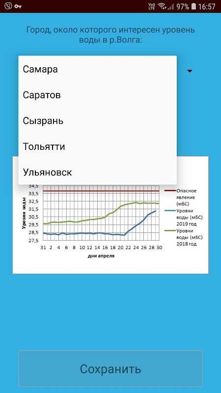 Una aplicación que muestra un widget con un gráfico del nivel del agua del río Volga en los embalses correspondientes de cinco ciudades: Samara, Saratov, Syzran, Togliatti, Ulyanovsk.