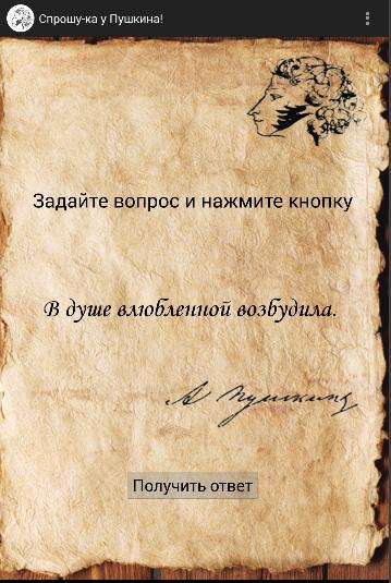 Aplicación para la adivinación "Yo le preguntará Individual Pushkin!" proporcionará la oportunidad de obtener una respuesta a cualquier pregunta. Lo suficiente como para formular una pregunta y haga clic. Es un antiguo método de adivinación - la adivinación por los libros. No hay necesidad de adivinar el número de página y el número de línea y, a continuación, profundizar en el libro. Por regla general, las respuestas son claras y comprensibles. Pero a veces hay que hacer de la fantasía para el descifrado. Obtención de respuestas es sobre los libros de Pushkin - Reunión de los poemas y la novela "Eugene Onegin". Si usted no sabe algo, pregunte Pushkin =)