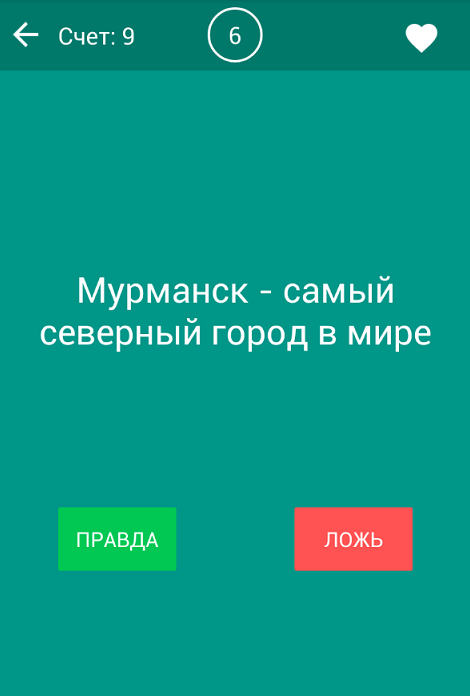 На каждый вопрос даётся 10 секунд и всего два варианта ответа: "ПРАВДА" или "ЛОЖЬ". Ответить неправильно можно только 3 раза за игру. Устанавливайте рекорды и соревнуйтесь с друзьями! Приятной игры!