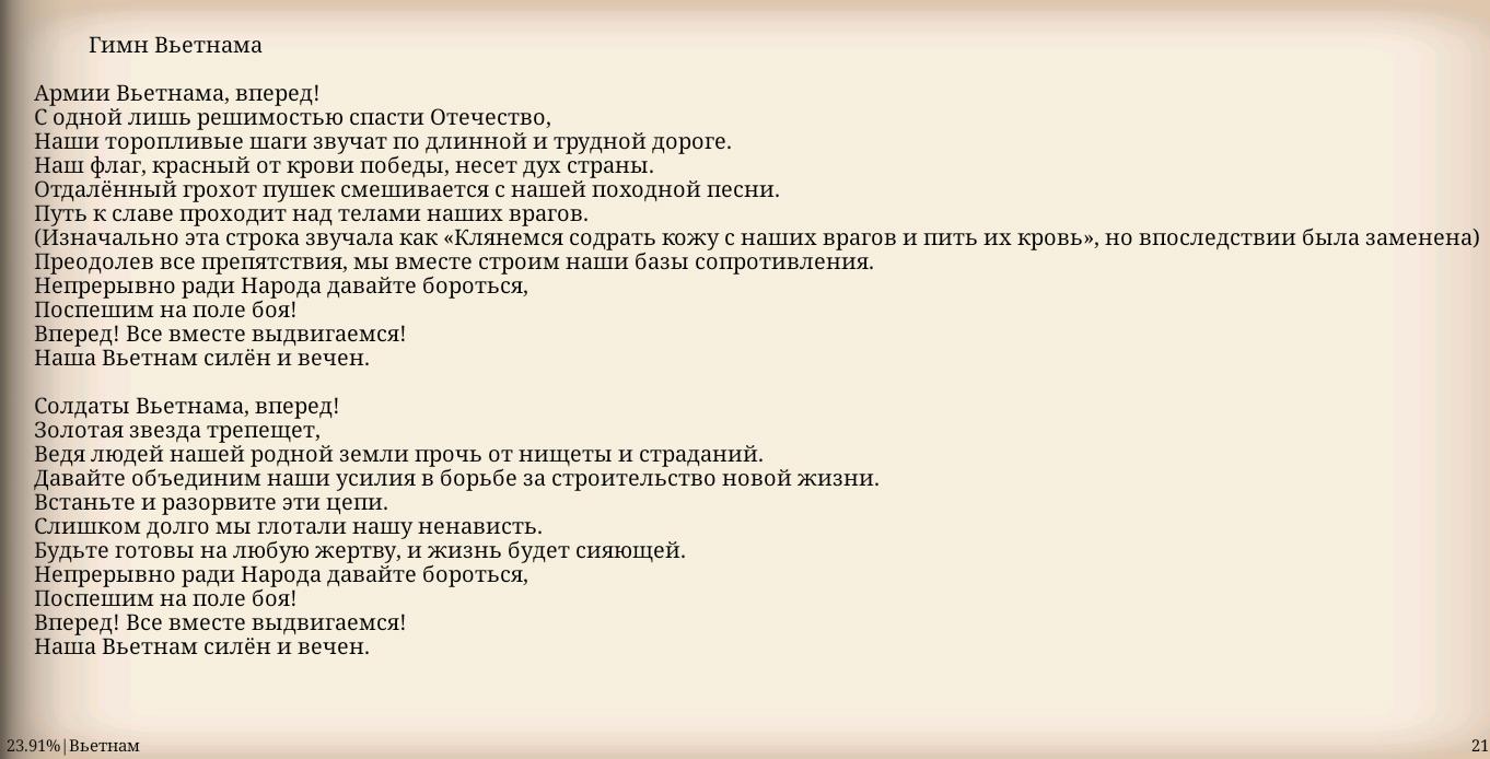 В данной книге я попытался собрать гимны всех стран мира. Уже на начальном этапе составления книги выяснилось, что из примерно 250-ти гимнов на русский язык переведена ровно половина, поэтому почти сразу пришлось засесть за словари - английские, французские, испанские, португальские и даже арабские. Некоторые гимны получились очень короткими, буквально 4-5 строк, некоторые, наоборот - по 10-15 куплетов (особенно это дело любят в южно-американских странах); в некоторых гимнах воспевается любовь к своей стране, её красота, выражаются пожелания охранить страну от войн, другие - более агрессивные, призывают к оружию, беспощадно убивать своих врагов, пить их кровь, ну или, по крайней мере, напоить их кровью свои пашни, порой даже указываются эти враги - конкретные другие страны; иные гимны - это скорее не гимны стран, а гимны монархов этих стран, где поётся хвала королю или шаху, расписываются его положительные качества, в некоторых случаях мельком упоминается и народ, но как правило в контексте, что "мы, народ, без промедления пойдём на смерть за тебя, наш любимый король"... Но что поразило более всего, так это то, что даже самые маленькие государства, какие-нибудь тропические острова с населением всего в тысячу - полторы тысячи человек, воспевают в своих гимнах свои страны, как "великие", "с древней историей" и "священные и уважаемые"... Возможно, нам есть чему поучиться у этих маленьких государств.