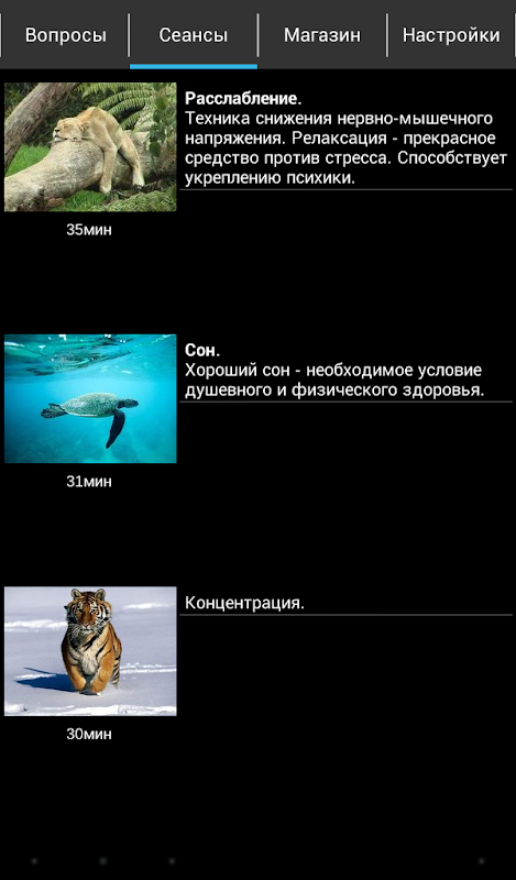 Después de instalar el programa es necesario descargar la música de fondo (50 MB) y sesiones, cada una de las cuales ocupa alrededor de 30 megabytes. Por favor asegúrese de que hay suficiente espacio libre en el dispositivo y ser paciente el tiempo de descarga. Utilizar las comunicaciones de alta calidad.