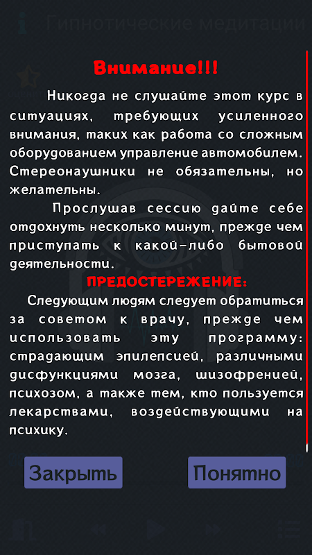 гипноза и НЛП в мире. Это приложение позволит вам буквально за считанные минуты начать понравившийся вам сеанс. Самогипноз в виде аудио записей в формате mp3 является крайне удобным в использовании. Вы можете прослушивать гипноз на mp3 в любом месте и в любое время и где угодно.
