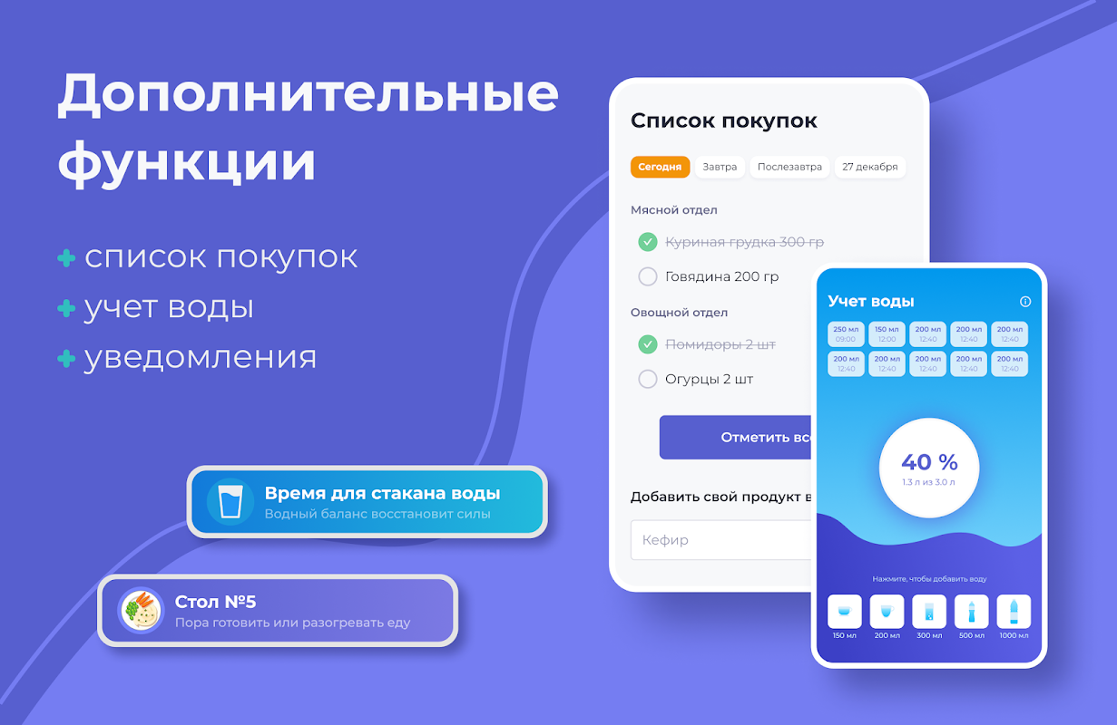 Todas las opciones de menú son creadas por dietistas y respaldan la ingesta diaria de KBZhU, la combinación óptima de productos y la frecuencia de su uso.