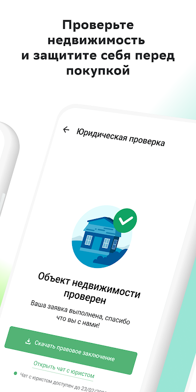 Домклик заботится о вашем спокойствии. Сервис юридической проверки для безопасного проведения сделки позволяет узнать историю недвижимости перед покупкой, проверить её и оформить сертификат на возмещение средств на случай непредвиденных рисков.