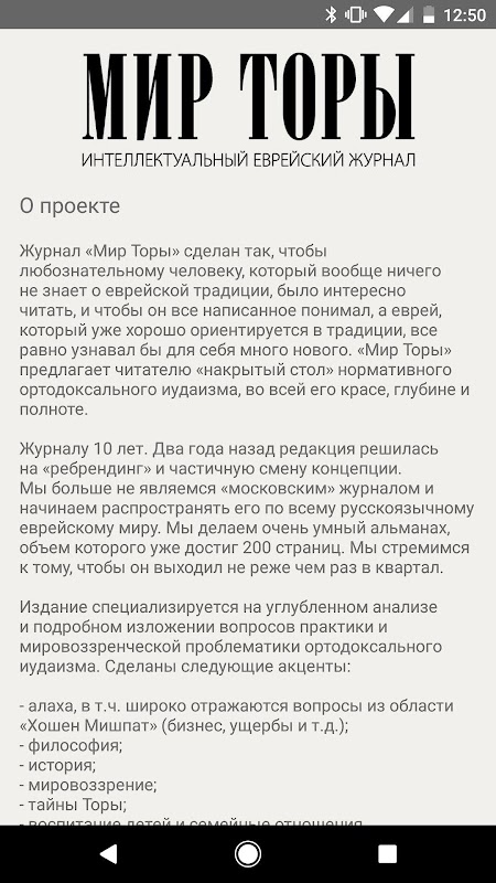 Muchos de nuestros artículos pueden estudiarse por las tardes en yeshiva, academias de teología judía, pero esto no significa que la publicación esté orientada a "talmudistas profesionales". Por el contrario, el propósito del Mundo de la Torá es convertir las páginas de la revista en Beit Midrash (" Teaching House ”), donde cualquiera que esté interesado en la tradición judía, y que ni siquiera haya logrado conocer el judaísmo adecuadamente, podrá aprender muchas cosas nuevas y sentir el sabor del aprendizaje, el sabor de un estudio real de la Torá. Es por eso que prestamos mucha atención, no tanto a la letra de la ley como a su análisis, preparación, aclaración de los principios y mecanismos que subyacen a ciertas normas.