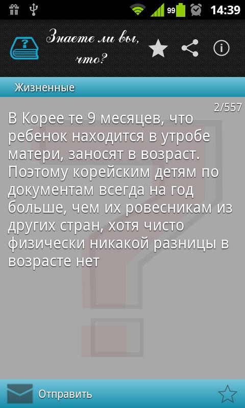 30 категорий занимательных фактов с удобной сортировкой, возможность сохранять избранные страницы и пересылать друзьям смской или публиковать на страницах социальных сетей. Начните разговор с понравившимся человеком со слов «Знаете ли вы, что…», и вы легко приобретете новые знакомства и репутацию эрудита. С нашим приложением вы не будете скучать в дороге, узнаете много нового, полезного и невероятного и получите пищу для размышлений.