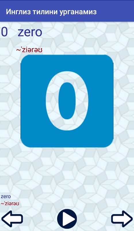 Bu dastur orkali siz ingliz tili harflari, sonlari, ranglar, oylar, shaklar wa boshkalarni urganishingiz mumkin. Har bir harf wa suz uchun alohida tovush yozilgan.