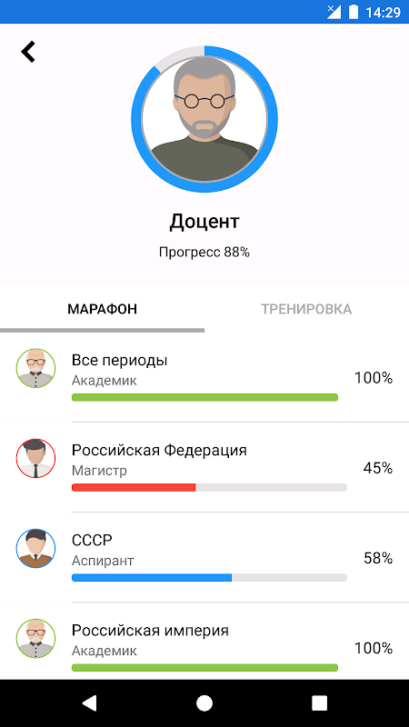 Las preguntas se distribuyen por nivel de dificultad. Los niveles básicos afectan los eventos y hechos clave, lo que te permite convertirte en un verdadero conocedor de la historia. Un nivel profundo le brindará la oportunidad de sentirse como un verdadero experto en el campo de la historia, ya que necesitará conocer los hechos más pequeños.
