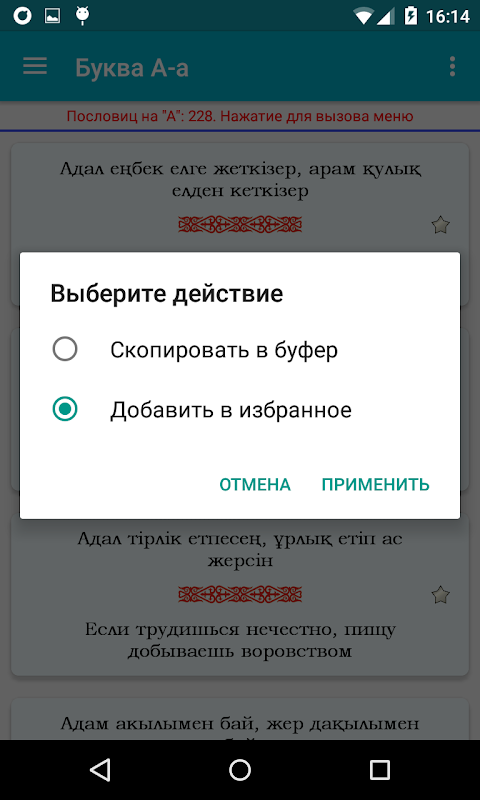 En el momento en que se recogió la aplicación sobre 1.500 proverbios y refranes en lengua kazaja. También hay una traducción o análogo proverbio ruso en Rusia, un significado similar a la original en el idioma kazajo.