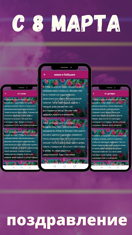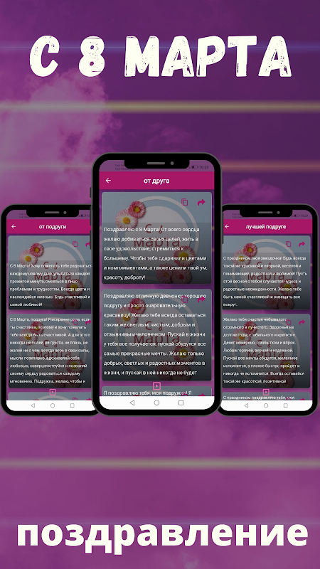 Nuestra aplicación es fácil de usar y le permite enviar tarjetas instantáneamente a sus seres queridos. ¡Haga que las vacaciones del 8 de marzo sean aún más brillantes y memorables con nuestras tarjetas!