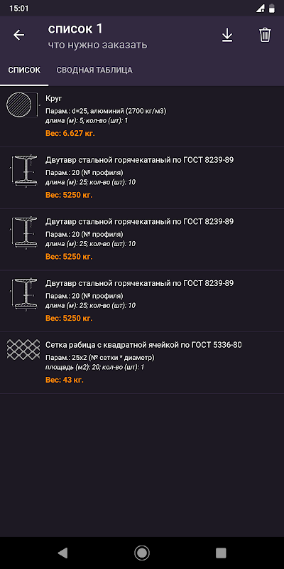 A también le permite calcular la masa aproximada de tubos redondos y con forma, cuadrados, círculos, láminas / tiras, hexágonos, ángulos, canales y vigas en I de tamaños arbitrarios de diferentes metales. Trabajo completo con el directorio de materiales (agregar, editar, eliminar y también ocultar material que no se utiliza).
