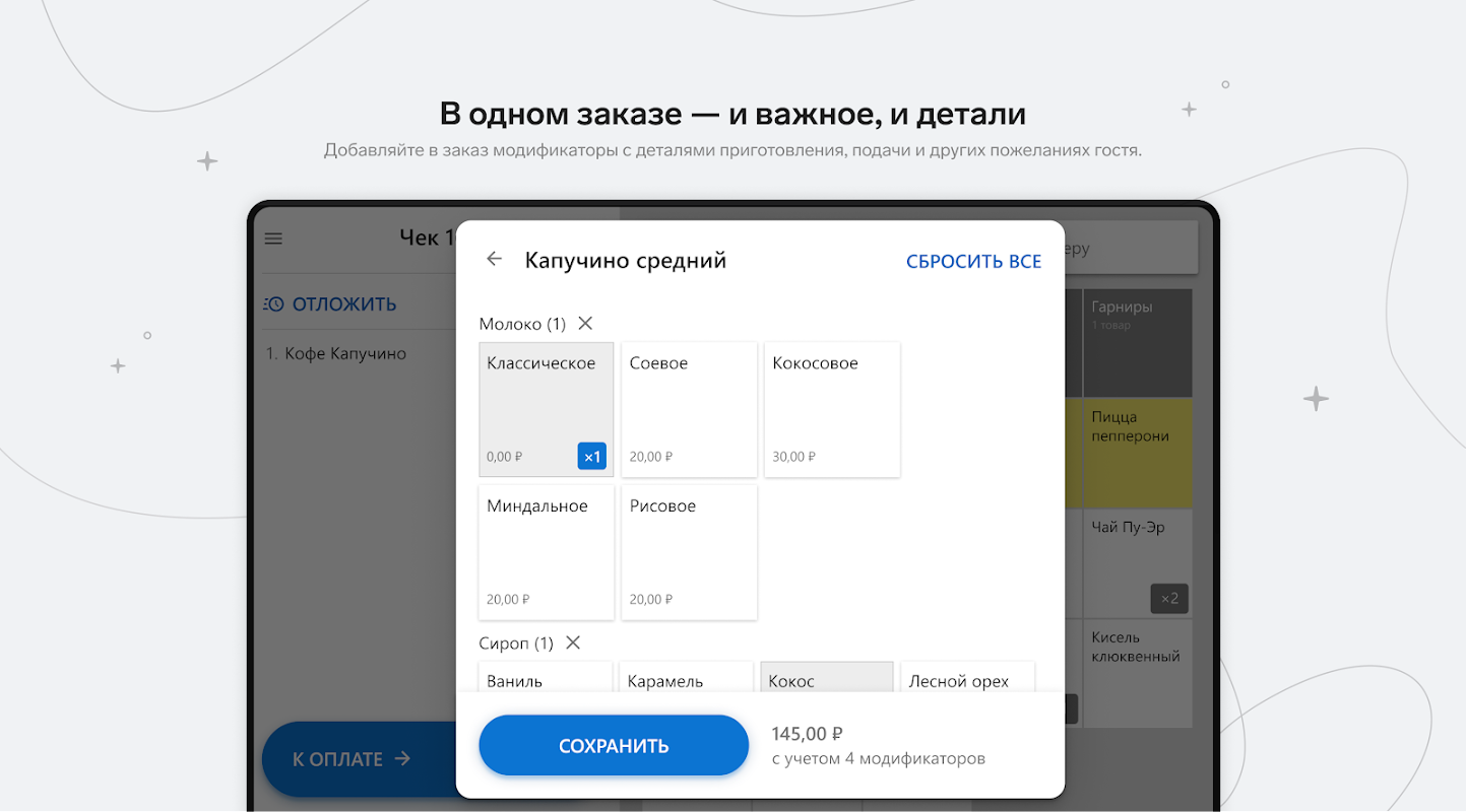 Cree pedidos directamente en la caja registradora para cada comensal o para todo el grupo.