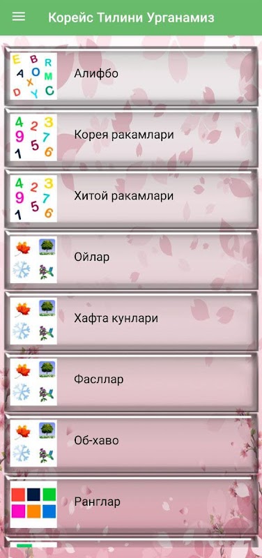 Бу дастур оркали сиз корейс тили харфлари, сонлари, ранглар, ойлар, шакллар ва бошкаларни уганимкин.